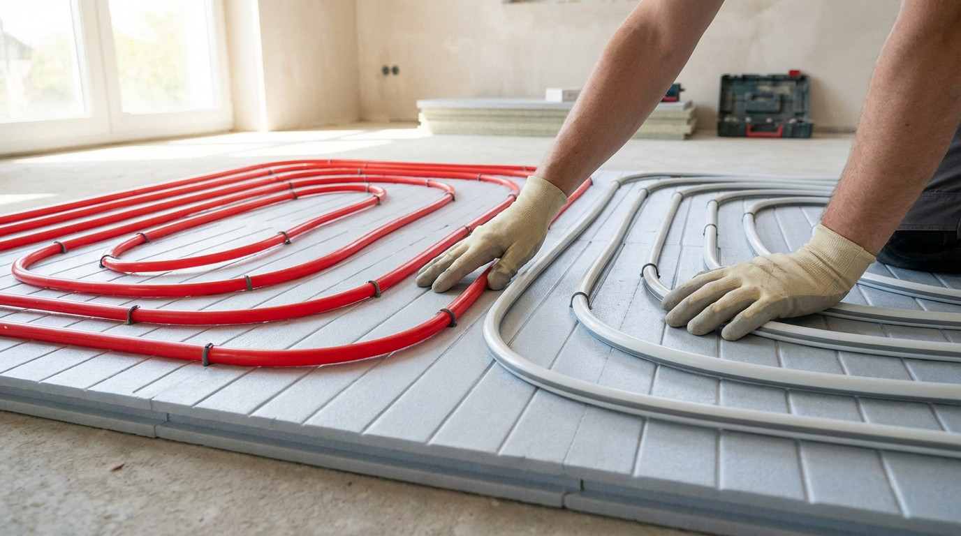 Le plancher chauffant repose sur la circulation d’eau à basse température, un terrain où le cuivre est hors-jeu. PER et multicouche sont parfaits ici car ils encaissent les contraintes thermiques sans la complexité des métaux rigides.
