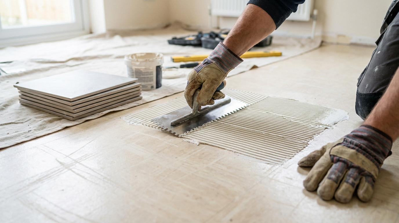 Close-up of gloved hands meticulously spreading tile adhesive with a notched trowel on a light linoleum floor. Stack of light ceramic tiles nearby for installation.