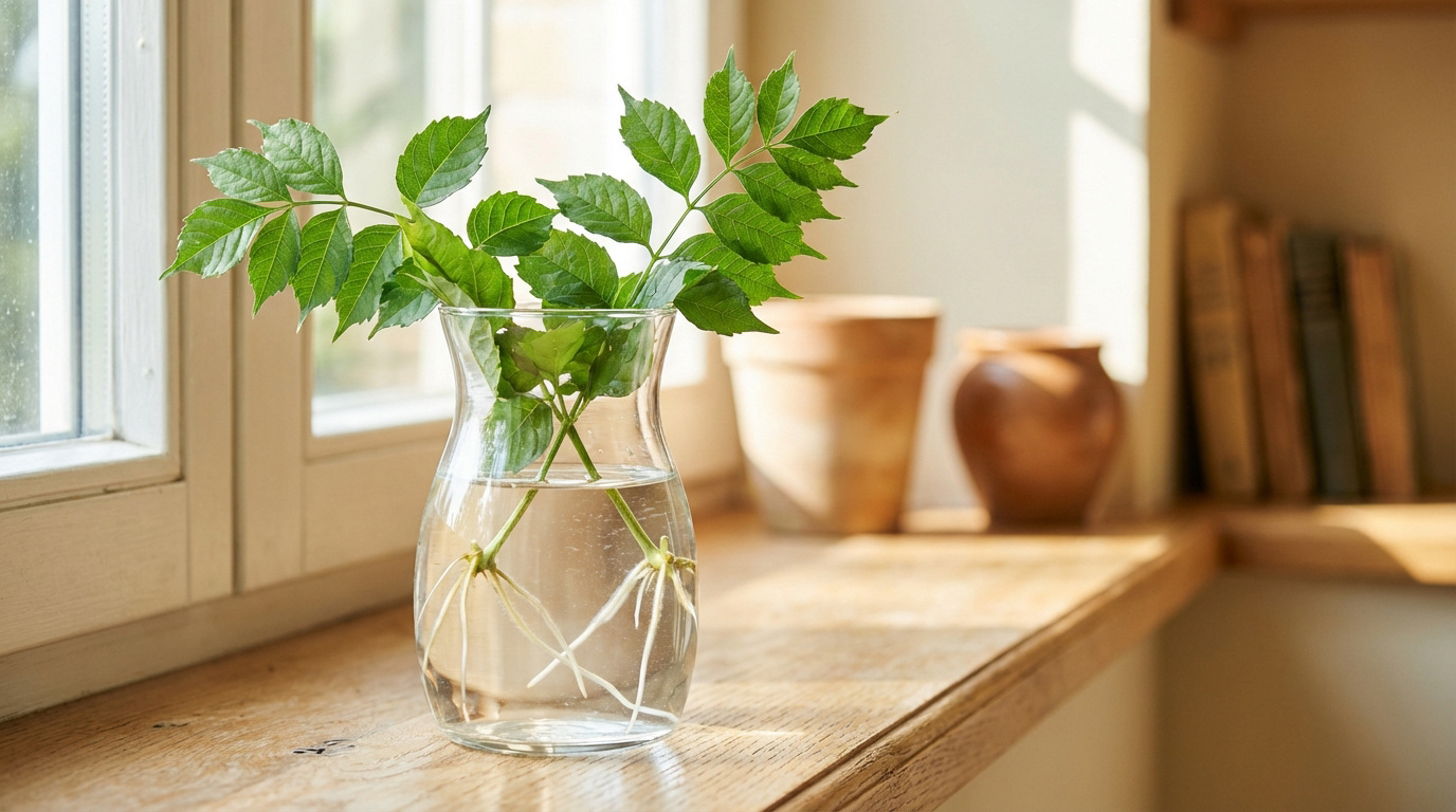 Une bouture de bignone avec de jeunes racines dans un vase d'eau, posée sur un rebord de fenêtre en bois ensoleillé.